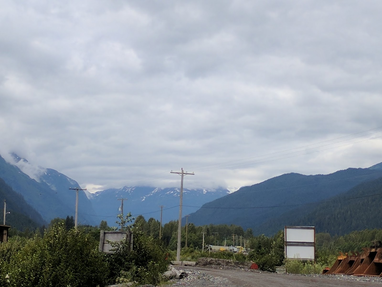 On 37 - it is up and down - we started at 800m - went up to 1200m - back down to around 450m - and so on. Following river valleys, and then take the pass between the various rivers - it was so very pretty. Lots of photos I did not get - either because no place to pull over - or I missed the place. Oh well. Also - I suspect that the low ceiling caused us to miss a bunch - but gosh - what we saw was so petty. Some really pretty rivers - fast flowing and wide. Creeks crossing under the road (bridges,culverts). We saw 4 separate black bears - which was cool - did not try to stop for a photo - I think on the bike that is a good call.